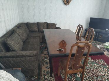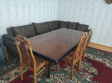 - Yemək masası: Təbii ağac teksturalı, parlaq laklı üst səth. Geniş ölçülü düzbucaqlı forma, kənarları yumşaq radiuslu. Masanın üstündə qoruyucu şüşə örtük görünür. Rahat yerləşim üçün uzun tərəflərdə daha çox oturacaq imkanı.