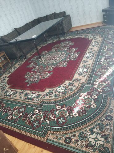 - Xalça: Geniş ölçülü, mərkəzi medalyonlu klassik naxış. Bordo, yaşıl və bej tonlarında çiçək motivləri ilə. Otağa isti və zərif görünüş qatır.