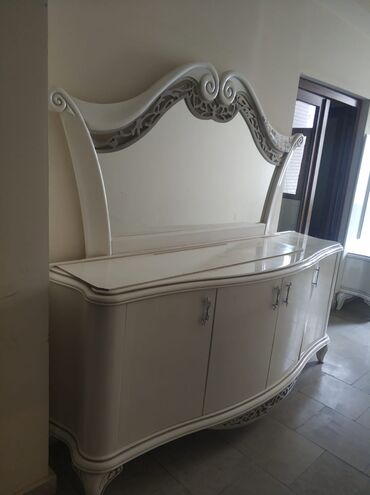 - Konsol-bufet: Ağımtıl-krem rəngdə, dalğalı konturlu fasad. Üst hissəsi geniş və parlaq, aşağı hissədə dekorativ oyma elementlər. Ön tərəfdə çoxsaylı qapılar və zərif metal tutacaqlar, daxilində saxlama üçün bölmələr. Üst hissədə iri dekorativ güzgü paneli ilə birlikdə.