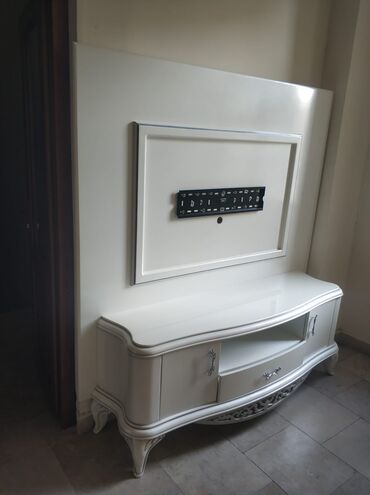 - TV stendi və dekorativ panel: Eyni kolleksiyadan, krem rəngli parlaq səth, klassik oyma detalı və zərif ayaqlar. Ortada açıq rəf, yanlarda qapalı bölmələr. Arxa dekor panelində divar asılqan braketi quraşdırılıb – TV asmaq üçün hazırdır.