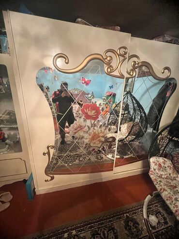 Yataq otağı dəsti - Dördqapılı qarderob: krem rəngli fasad, qara ornamental naxışlar, ortada iri dekorativ güzgü (iki qapıda), bükümlü metal tutacaqlar, dayanıqlı ayaqlar. - Çarpayı: yumşaq krem r...