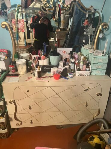 Yataq otağı dəsti – 760 AZN Çatdırılma pulsuz Komplektə daxildir: - 4 qapılı dolab: iki güzgülü orta qapı, yanlarda rəf və asılqan bölmələri, qızılı dekor xəttləri. - Dresser (makiyaj masası) və...