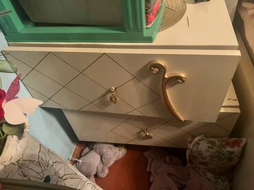 4) Tumba/komod – 2 çekmece, qızılı iri dekorativ qulplar, ön paneldə romb naxışı.
