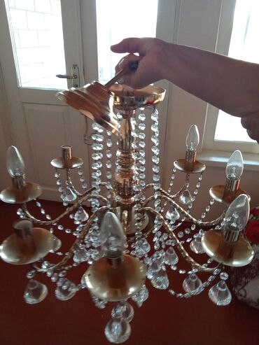 - Material: qızılı rəngli metal korpus, şüşə/kristal asmalar və bəzək zəncirləri