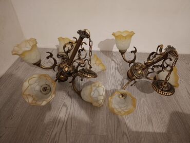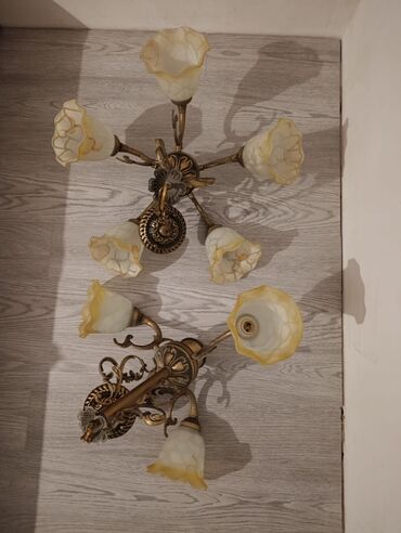 - Material: tökmə metal (bronza rəngli) korpus, bəzəkli oyma elementlər, zəncirli asma; şüşə plafonlar