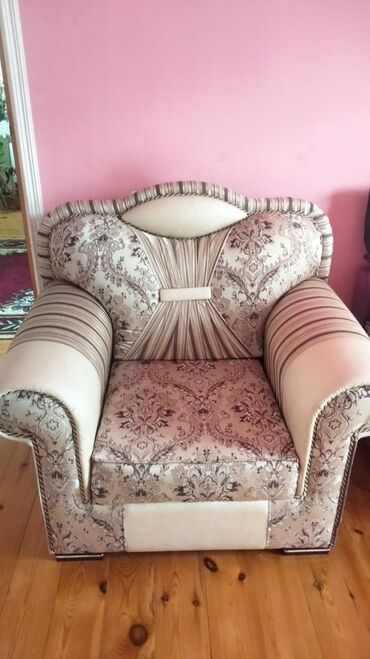 Dəst, eyni dizayn və üzlükdə olan divan və iki kreslodan ibarətdir.