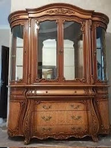 Klassik üslubda massiv taxtadan hazırlanmış mebel dəsti Tərkibi: - Geniş vitrin şkafı: dörd şüşə qapı, içəridə şüşə rəflər, aşağıda dekorativ çekmece. Krujevalı oyma detallar və üst hissədə orname...