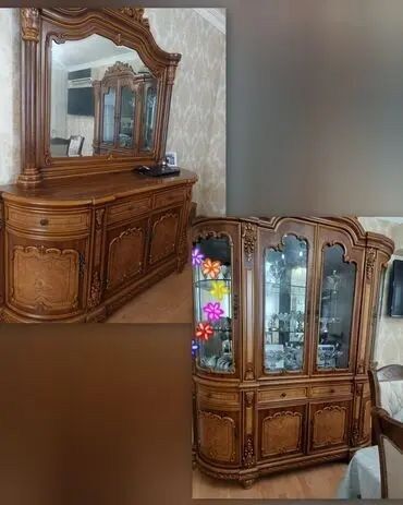 Klassik dəst: vitrin şkafları və komod güzgü ilə - Üslub: klassik/oyma barokko üslubunda, zəngin naxışlı fasadlar, dekorativ tac və sütun elementləri - Material: təbii ağac karkas və ön panellər; ...