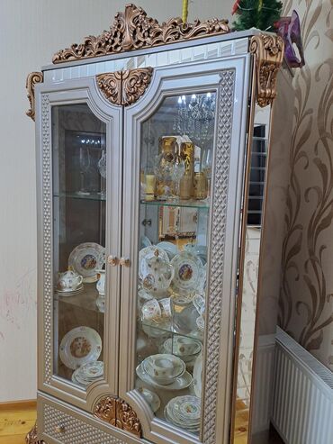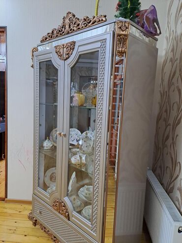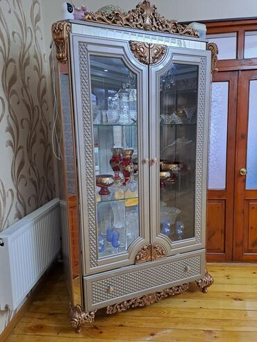 Klassik interyerlərə uyğun, salon və qonaq otağı üçün eleqant vitrin mebel. İçəridə şüşə rəflər ağır qab-qacaq və dekorları sərgiləmək üçün geniş və möhkəmdir.