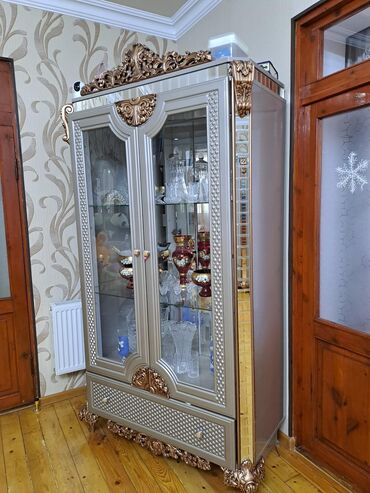 - İki qapılı şüşə vitrin – ön və yan panellər güzgülü, içərisi 3 mərtəbəli şüşə rəflərlə.