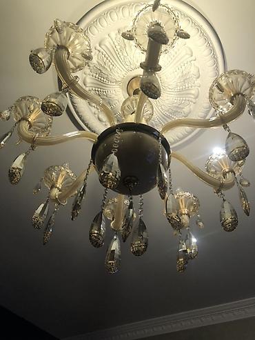 - Dizayn: 8 qollu, qövsvari şüşə qollar, mərkəzdə kasalı gövdə; çoxsaylı asma prizmatik/kəsmə bəzəklər