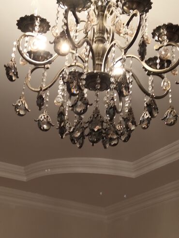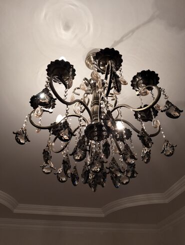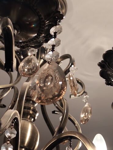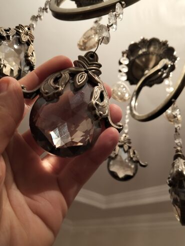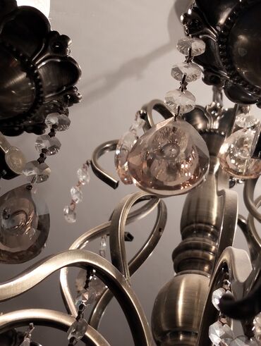 - Dizayn: çoxqollu konstruksiya, dalğavari metal qollar, iri armud formalı və disk formalı kristal detallarla zənginləşdirilib