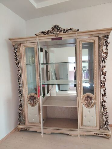 - Materiallar: Şüşə vitrin qapıları və iç rəflər, güzgülü arxa panel; fasadda kapitone effektli panellər dekor daşcıqları ilə.