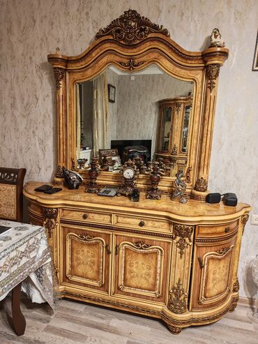 - Dizayn: barokko/rokoko estetikası, relyefli oyma naxışlar, karniz və sütuncuq detalları, bəzəkli rozetlər