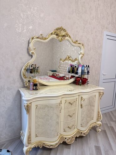 - Tualet masası güzgü ilə: dalğalı konturlu konsol tipli masa, mərkəzdə 3 çəkməcə, hər iki yanda qapalı bölmə; iri dekorativ çərçivəli güzgü, krem-qızılı ornamentlər, oyma ayaqlar.