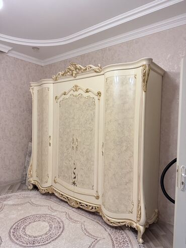 - Geniş 4 qapılı şkaf: qabarıq oyma dekorlar, krem rəngli mərmər effektli panellər və qızılı işləmələr. Hündür profilli üst tağ, dekorativ alt baza və relyefli ayaqlar. Daxildə asılqan bölmələri və rəflər üçün geniş yer (daxili komplekt görüntüdə görünmür).