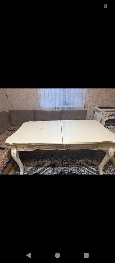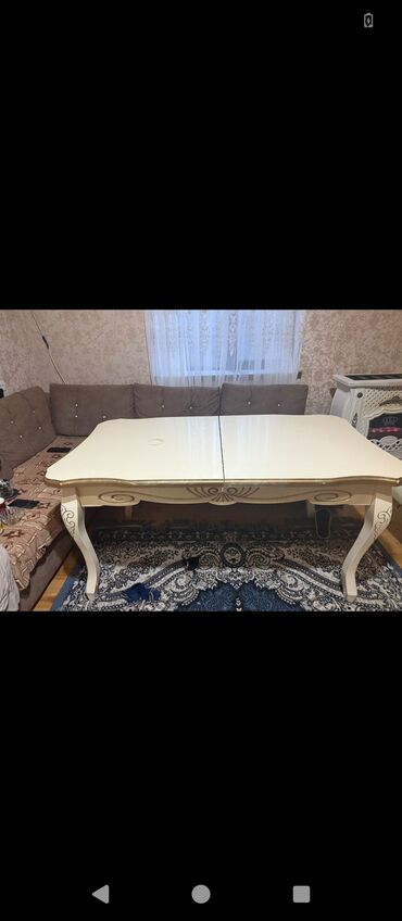 Krem rəngli yemək/otaq masası - Korpus və ayaqlar taxta materialdan, krem boyalı. - Üst səth ovala yaxın yumru künclü düzbucaqlı formadadır, kənarlarda dekorativ perimetr xətti var. - Ortadan iki ...