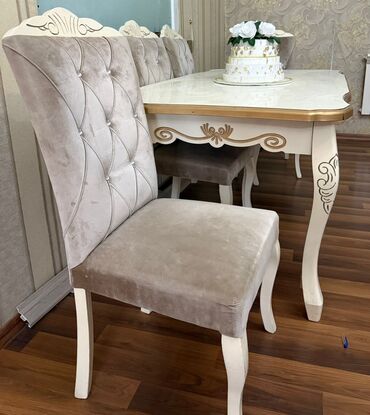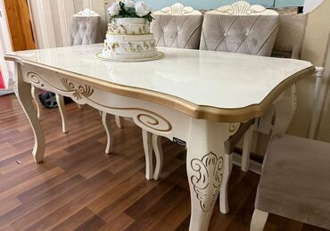 Klassik üslubda dəst – qonaq otağı mebeli Komplektin tərkibi: - Oval formalı, parlaq açıq rəngli üstlü iri yemək masası (metal/qızılı tonlarda baza). - 8 ədəd yumşaq parça oturacaqlı stul (qızılı ...