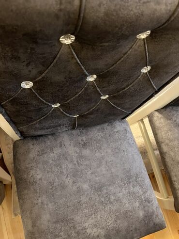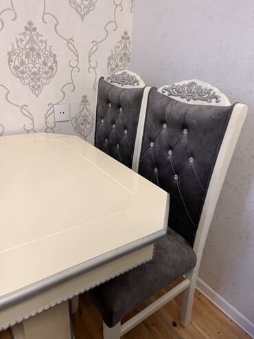 - Dizayn: masanın ətəyində və stul kürəklərində güllü-qabarıq naxışlar, kənarlarda gümüşü bordür; kürək hissəsində kapitone tikiş və dekorativ daş düymələr