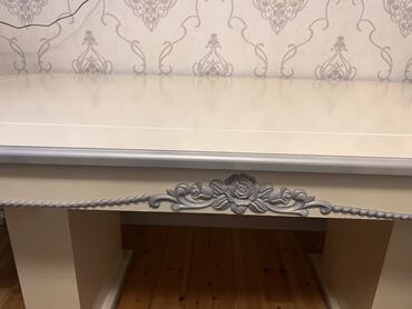 - Masa səthi: geniş, hamar krem panel, kəsik künclü formalar, dekorativ relyef çərçivə