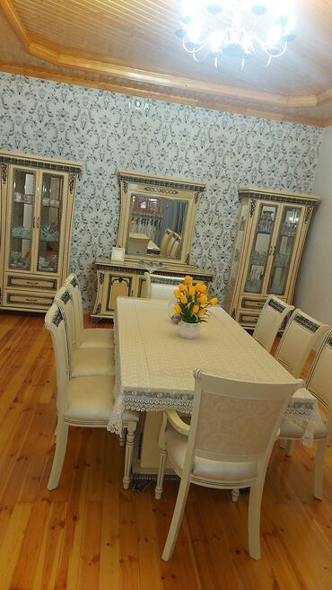 - Masa və 6 ədəd yumşaq oturacaqlı stul (arxa hissədə naxışlı parça, krem rəng tonları)