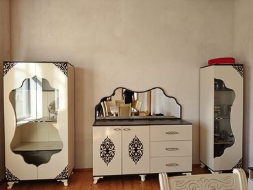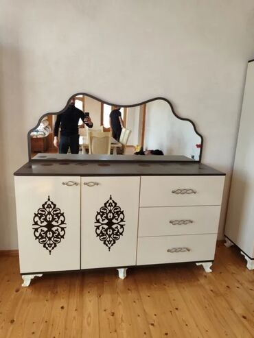 - Konsol/komod güzgü ilə: Üst tabla tünd qəhvəyi, dalğalı konturlu böyük güzgü. Sol hissədə dekorativ naxışlı iki qapı arxasında geniş rəfli bölmə, sağ hissədə 3 dərin çekmece. Zərif, bükülü formalı tutacaqlar və fiqurlu ağ ayaqlar.