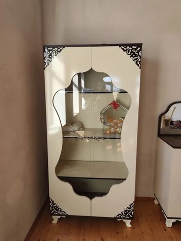 - Vitrin şkaf: İkiqapılı, ön hissəsi dekorativ naxışlı şüşə ilə. İçəridə 3 səviyyəli şüşə rəflər, aksesuar və qab-qacaq sərgiləmək üçün uyğundur. Korpusda krem rəng və tünd qəhvəyi kontrast, künclərdə ornament detalları, fiqurlu ayaqlar.