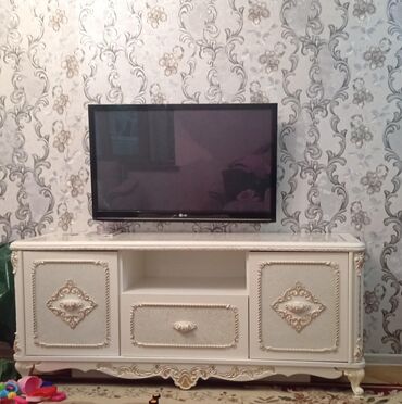 - TV altlığı/mediastend: iki yan qapalı bölmə, ortada açıq rəf və bir çekmece. Krem-qızılı ornamentlər, fiqurlu ayaqlar.