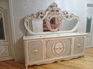 Klassik üslubda qonaq otağı mebel dəsti Tərkibi: - Böyük güzgülü konsol/komod – mərmər görünümlü üst səth, 4 qapılı geniş saxlama bölməsi, dekorativ relyeflər və qızılı bəzəklər. Üstündə böyük ölç...