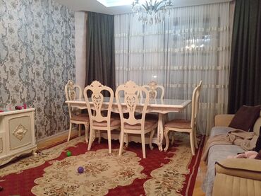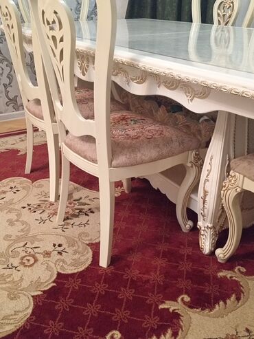 Klassik üslubda yemək otağı dəsti Tərkibi: - Masa: düzbucaqlı, krem rəngdə, oyma detallı dekorativ ayaq. Üstündə zərif naxışlı krujeva süfrə. - 6 ədəd stul: krem rəngli karkas, yumşaq boz parçalı ...