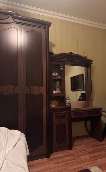 - Tuzlu stol (makiyaj masası) güzgü ilə: üstündə bəzəkli çərçivə, yan tərəfdə açıq raflı vitrinqa hissəsi, aşağıda çekmecə və şkaf qapısı, geniş iş səthi.