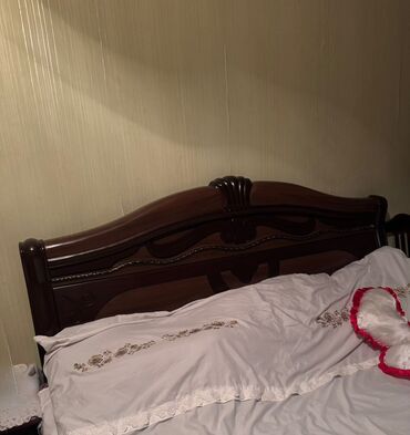 - İki nəfərlik çarpayı: başlıq hissəsi zərif oyma naxışlarla, tünd-qəhvəyi ağac teksturası, klassik formalar.