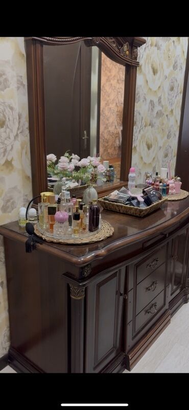 Yataq otağı mebel dəsti - Rəng: tünd qəhvəyi/taxta tonları - Tərkib: • Geniş güzgülü makiyaj masasının alt hissəsi – 4 çekmecəli, qızılı rəngli tutacaqlarla. Üst hissə geniş səthlidir, aksessuar...
