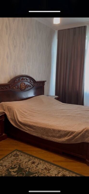Yataq otağı mebel dəsti Tərkib: - Geniş çarpayı (yumşaq başlıq, taxta karkas, qəhvəyi ağac teksturası) - 3 qapılı qarderob (orta hissədə dekorativ oyma panel və güzgü elementləri, qızılı tutacaqla...