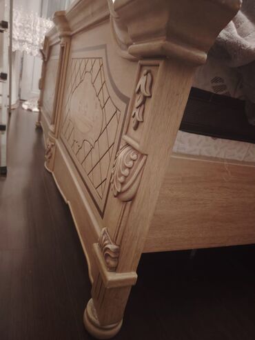 - Dəst tərkibi: ikinəfərlik çarpayı (başlıq və ayaqlıqda oyma decor), iri 6 qapılı qarderob şkafı, iki tumbalı komod/stellaj elementləri (şəkillərdə).