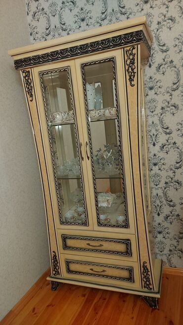 - İki qapılı cam vitrin şkafı – şüşə rəflər, alt hissədə iki çekmece