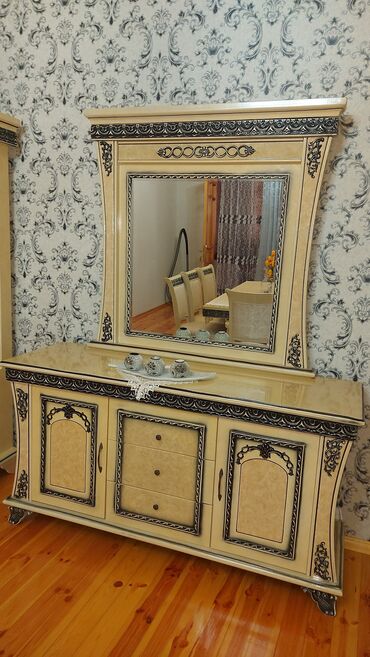 - Geniş bufet/komod və böyük çərçivəli güzgü – mərkəzdə 3 çekmece, iki yanda qapalı bölmələr