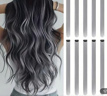 Gümüş-boz rəngli klipsli saç tirləri (hair highlights) – tez və təhlükəsiz həcm/rəng əlavə etmək üçün.