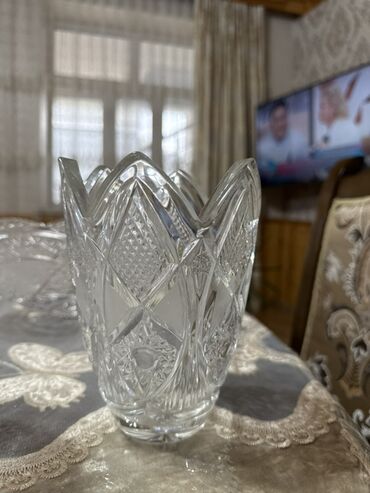 Kəsimli şüşədən dekorativ vaza. - Material: qalın, şəffaf şüşə (kristal effekti) Xtustal - Dizayn: dərin kəsim ornamentləri, ulduz və romb naxışları; işığı gözəl şəkildə sındırır və parıltı yaradı...