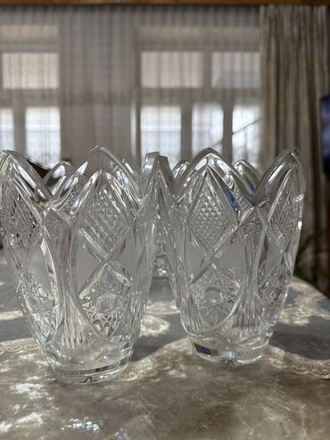 Kristal dekorativ vazalar – 2 ədəd dəst 30₼ - Material: qalın, şəffaf kristal şüşə - Dizayn: kəsimli və oyma naxışlı, üst hissəsi ləçəkvari dişli kənarla - Forma: silindrikdən konusvari keçid, sab...