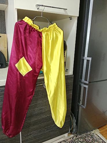 - Şalvar: yarısı sarı, yarısı bordo, elastik bel, ətəklərdə yığma kəsim, bir tərəfdə kontrast kvadrat aplikasiyası