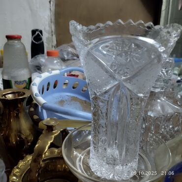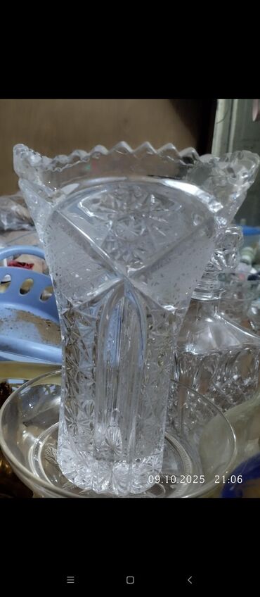 Kəsimli şüşə vaza - Material: şəffaf qalın şüşə (kristal üslubunda kəsim naxışları) - Dizayn: ulduz və rombvari oyma ornamentlər, yuxarı kənarda dalğalı haşiyə - Forma: aşağıdan yuxarıya doğru gen...