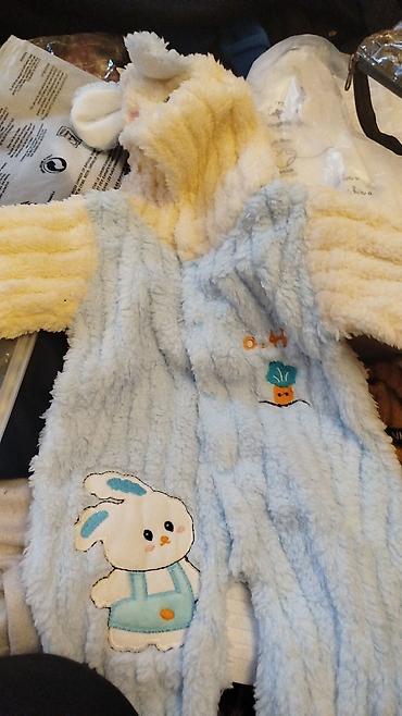 1) Açıq-mavi kombinezon – krem rəngli qollar, başlıqlı; ön hissədə dovşan aplikasiyası və kiçik naxışlar.