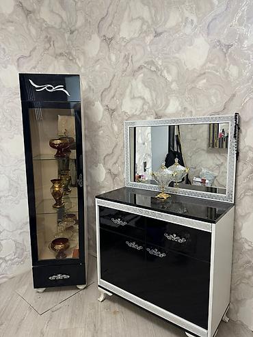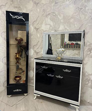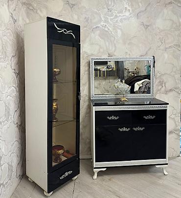 - Şkaf-vitrin: tək qapılı, şüşə vitrinli, 3 səviyyəli şüşə rəf, alt hissədə çekmece. Dekorativ ornamentli ön panel.
