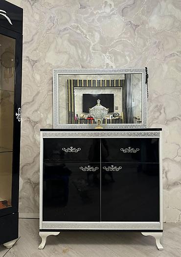 - Komod: 2 kiçik üst çekmece + 2 iri qapılı bölmə, metal tutacaqlar, dekorativ gümüşü haşiyə.