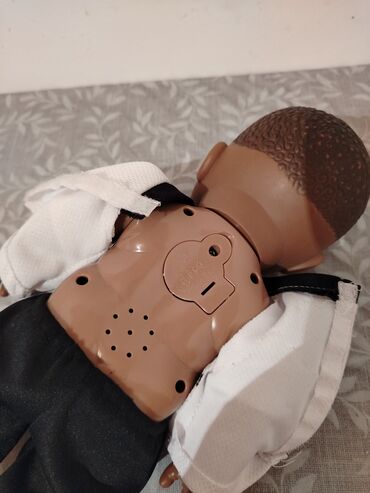 Ağ və qara rəngli futbol geyimində, tünd dərili körpə kukla. Kuklanın arxasında səs funksiyası üçün dinamik deşikləri və batareya qapağı var. Bu kukla uşaqlar üçün əla oyuncaqdır.