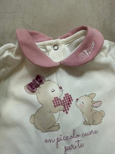 Körpə qızlar üçün Chicco markasına aid uzunqol don. Ağ rəngli üst hissəsi bənövşəyi yaxalığa malikdir və üzərində dovşan təsvirləri ilə bəzədilmişdir. Çəhrayı rəngli ətək hissəsi xırda naxışlarla tamamlanmışdır. Donun arxa hissəsində düymələr mövcuddur. Bu don, kiçik qızlar üçün rahat və şirin bir seçimdir. Gündəlik geyim üçün uyğundur.