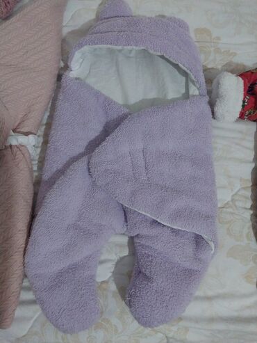 - Bənövşəyi “ayaqlı” sarğı kombinezon: plyuş/şinşilla tipli yumşaq parça, ağ astar, qulaqlı kapüşon. Ön hissəsi üst-üstə bağlanan örtüklə bədəni tam əhatə edir, ayaqları ayrıca bölməlidir.