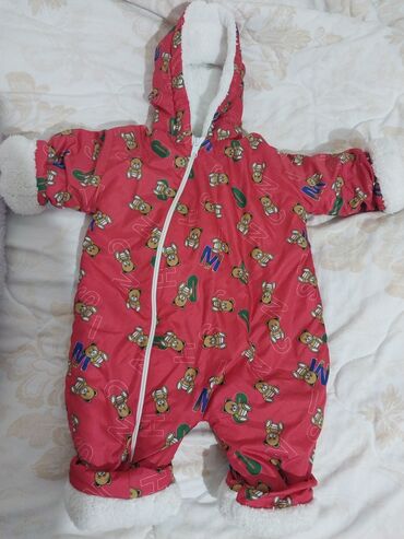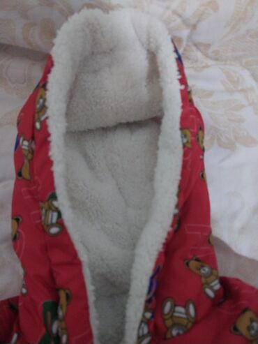 - Qırmızı qış kombinezoni: tam ön fermuarlı, kapüşonlu, içi ağ tüklü/isti astarlı. Üzərində şən ayı fiqurlu printlər, qollarda və balaqda tüklü manjetlər.