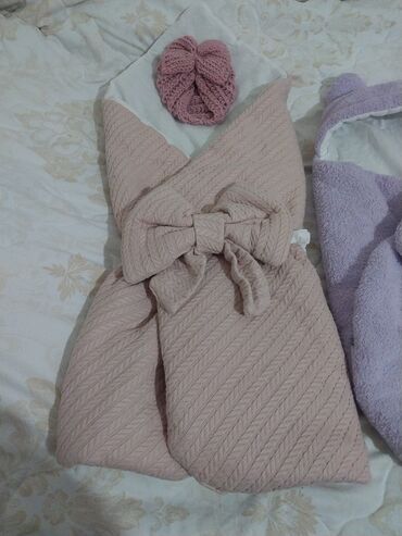 - Pudra rəngində sarğı-blanket: yumşaq, naxışlı toxumadan, içi ağ parça astarlı. Ön hissədə iri bant dekoru ilə bağlanır, yeni doğulanın bükülməsi və rahat daşınması üçün uyğundur.